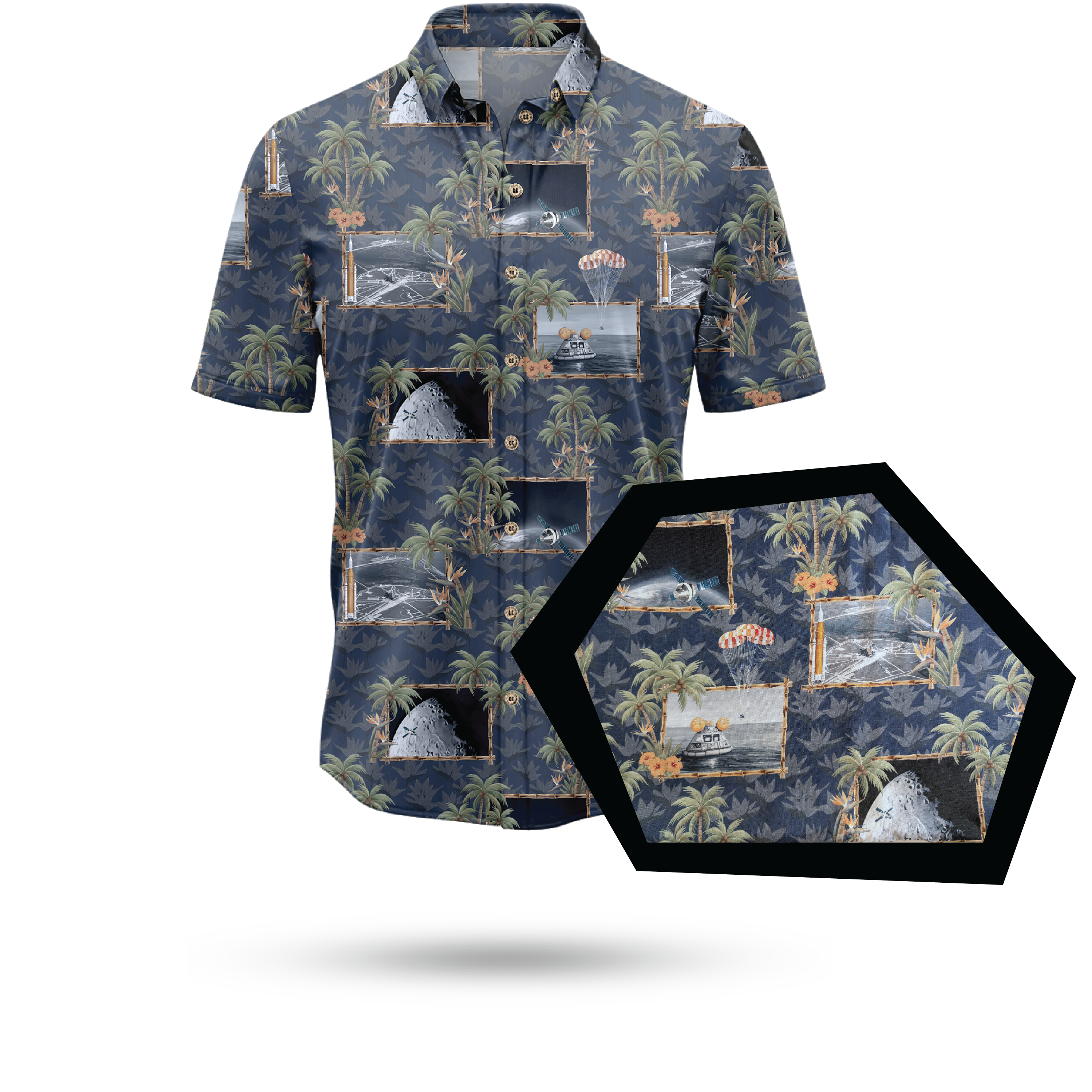 The Artemis Hawaiian shirt honors NASA’s return to the Moon—a mission to land the first woman and next man on the lunar surface and pave the way for Mars. Inspired by the Artemis Program, it fuses tiki artistry with modern aerospace design, blending mythology, science, and mid-century elegance into one intelligent composition.