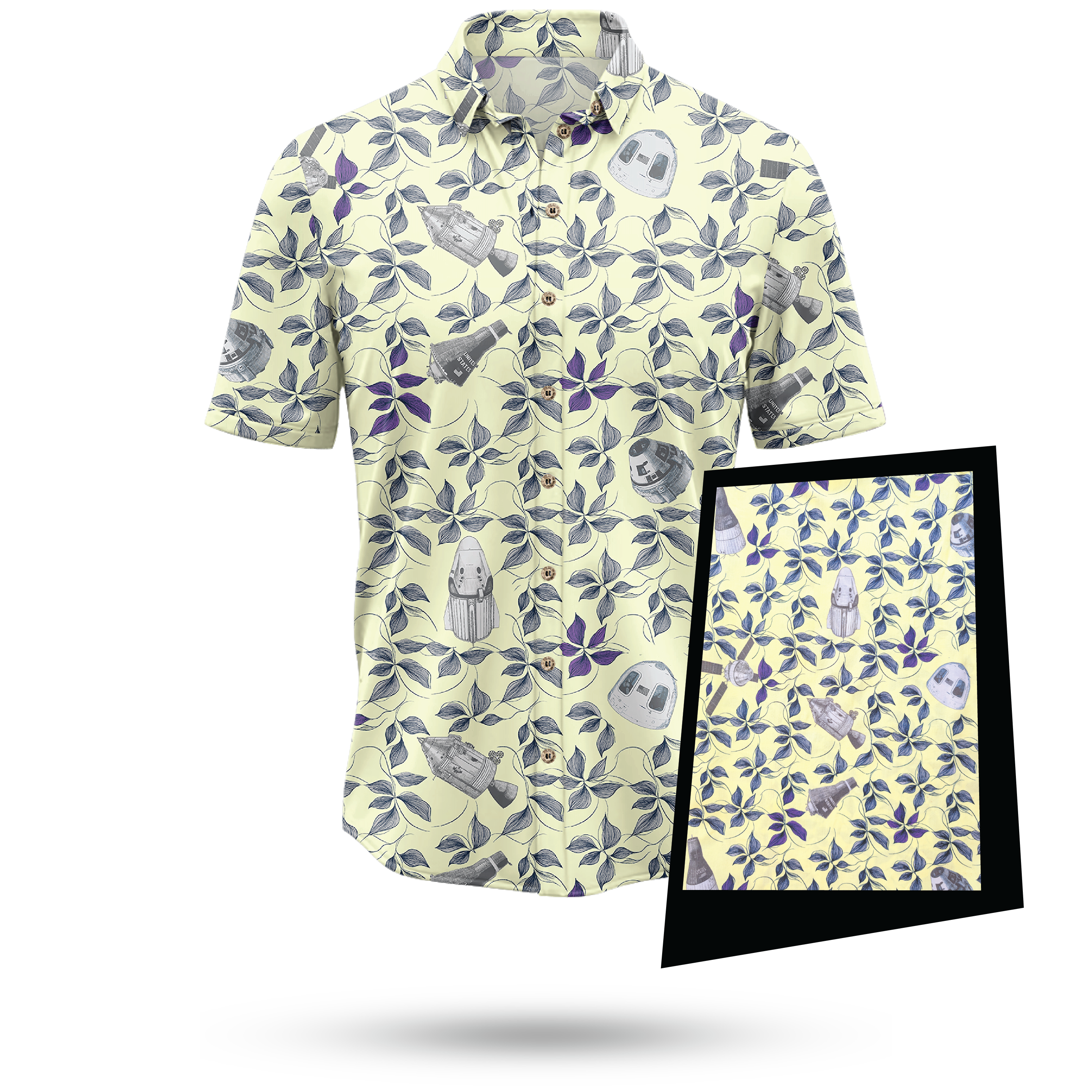 Honor the legacy of human spaceflight with the Capsules of Exploration Hawaiian shirt by Cape Kennedy Clothing. Featuring the iconic silhouettes of Mercury, Gemini, Apollo, Orion, Dragon, and New Shepard, this vintage-inspired design pays tribute to the engineering that carried astronauts beyond Earth and safely home. Made from a soft, breathable cotton-rayon blend, it offers a relaxed aloha fit, coconut buttons, and Space Coast heritage in every stitch—from splashdown to liftoff.
