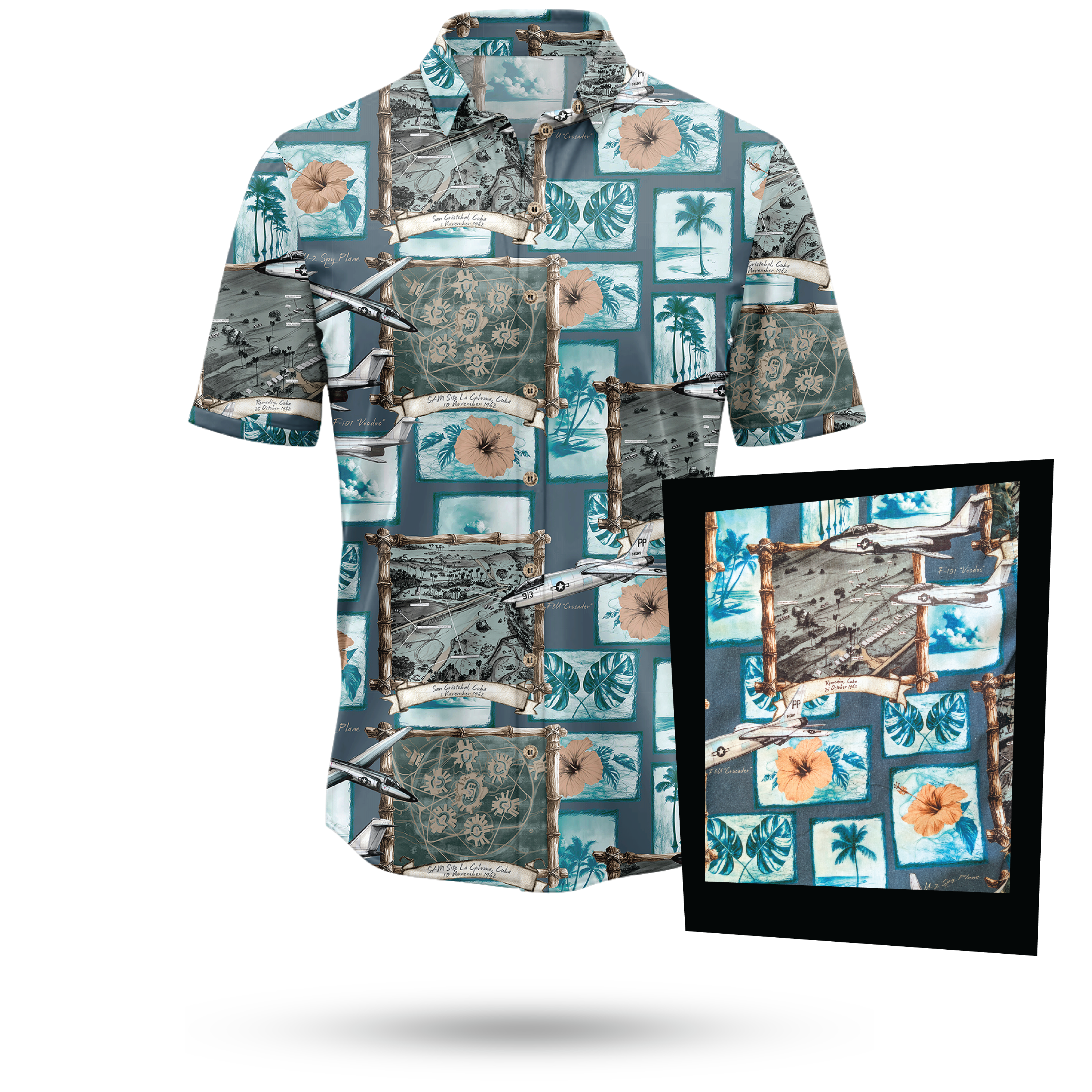 The Cuban Missile Crisis Hawaiian Shirt by Cape Kennedy Clothing honors the reconnaissance pilots and aircraft—U-2, F-8 Crusader, F-101 Voodoo—whose photography confirmed Soviet missile deployments in Cuba. Featuring briefing board diagrams and Cold War flight iconography, it’s crafted in a relaxed aloha fit for those who value history over heroics.